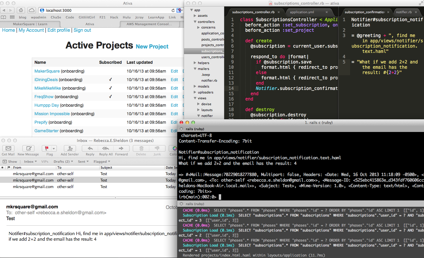 Screen Shot 2013-10-16 at 11.26.13 AM Published October 17, 2013 at 1440 × 878 in Automate Emails ← Previous Next → On the right you can you see the rails server returning info about the sent email. Behind Terminal you can see some of the code in Sublime. Like Loading...