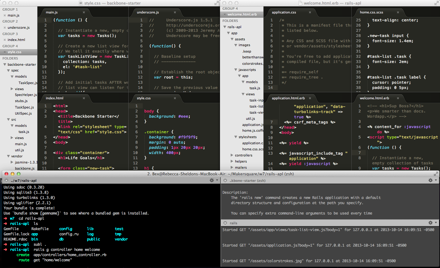 BB vs Rails Screenshot Published October 17, 2013 at 1440 × 877 in portfolio ← Previous Next → Backbone compared to Rails in sublime + Terminal running the code & rails server in the bottom half. Like Loading...